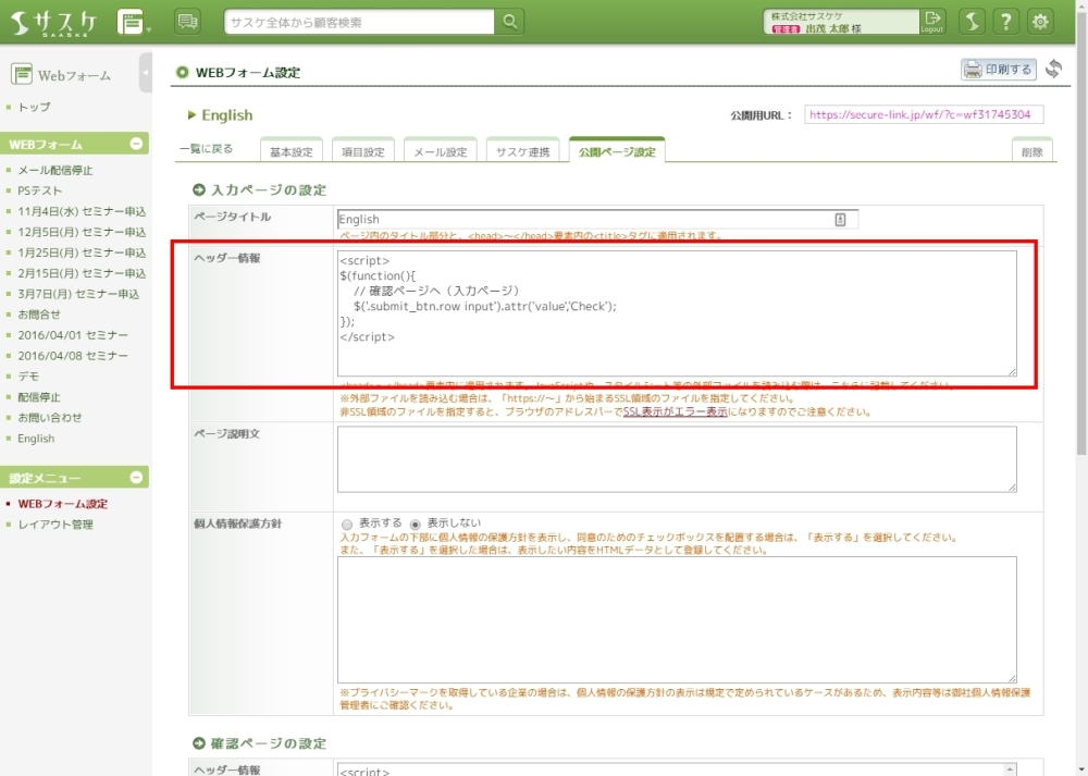これを英語等にするには「公開ページ設定」の「ヘッダー情報」にて以下のJavaScript、もしくはjQueryを入力します。