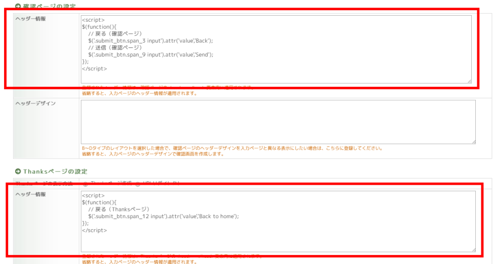 確認ページ・Thanksページでは