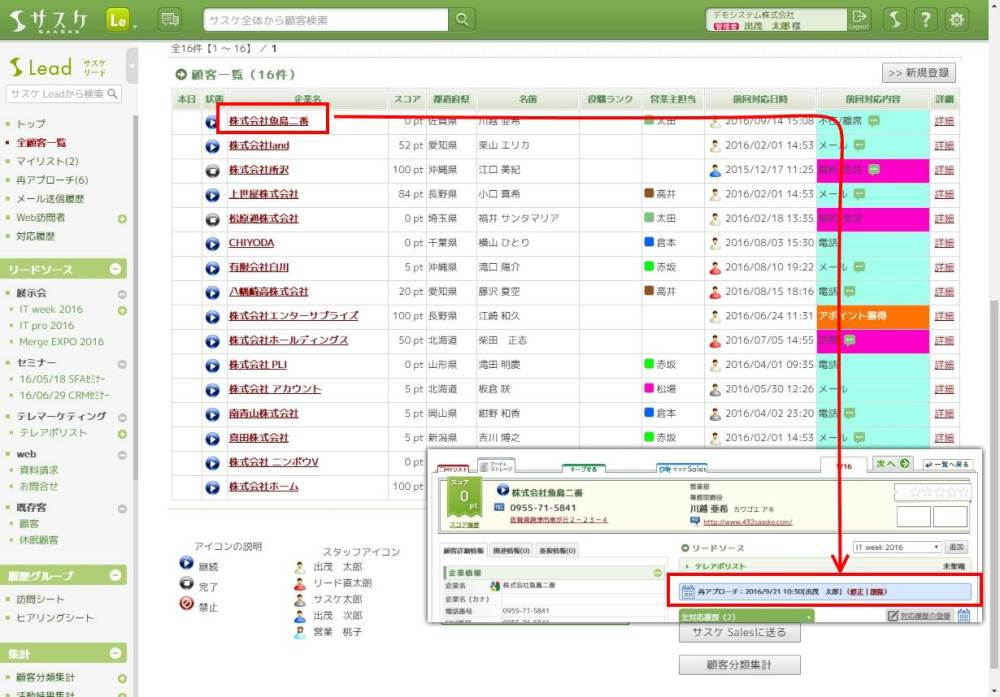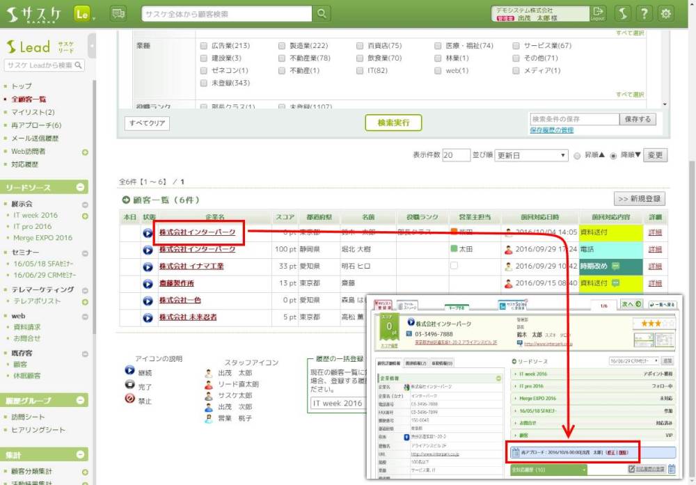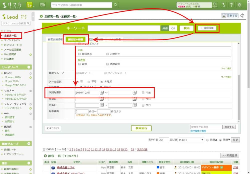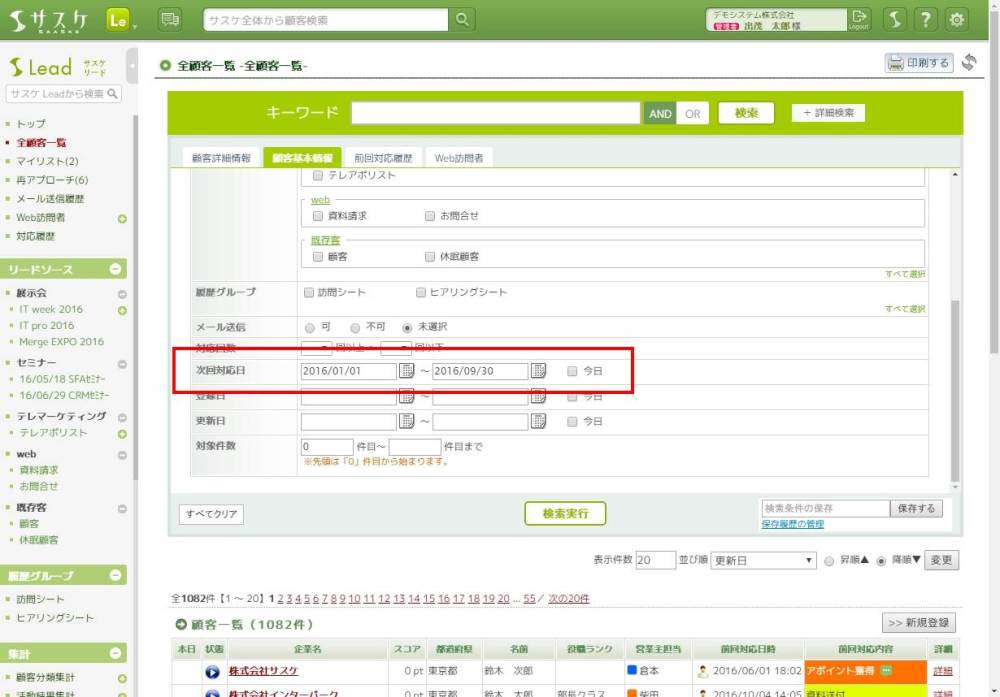 例えばですが「全顧客一覧」の詳細検索にて、「顧客基本情報」の「次回対応日」にて【2016/10/01 ~ 】と入力し検索を行うと、10月1日以降全ての再アプローチを検索することが可能です。これにより、本日以降全ての再アプローチを検索することができます。