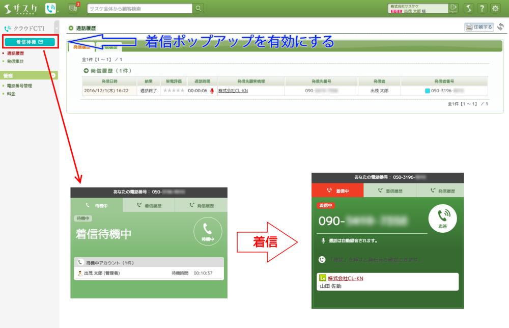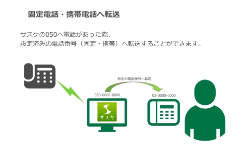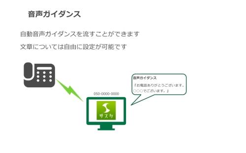 サスケの電話番号(050-)に着信・折り返しがあった際の設定を行うことができます。