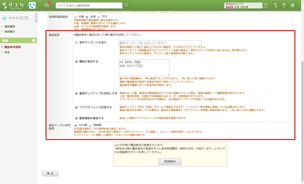 「電話番号の新規登録」という画面に移りました。ここでは以下の設定を行います。