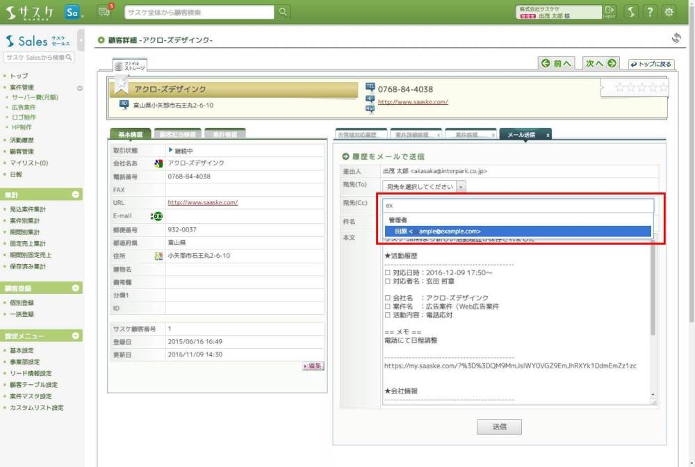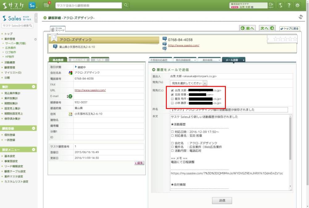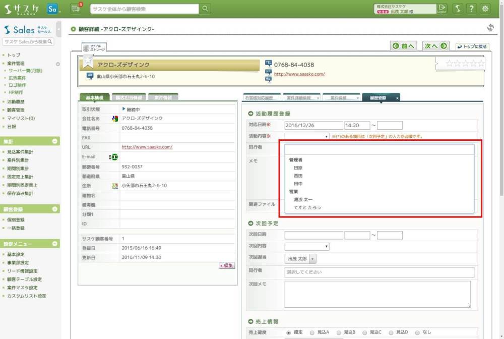 サスケSalesのアップデート【活動履歴のメール送信機能強化】【活動履歴の同行者機能強化】