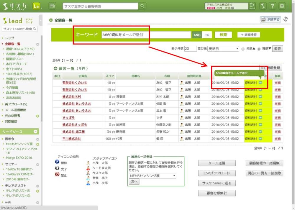 対応履歴の情報は、ヘッダーの検索・顧客一覧のキーワード検索どちらからでも引っかかります。