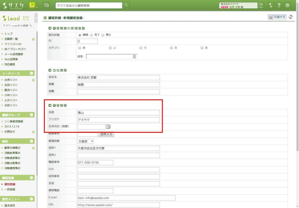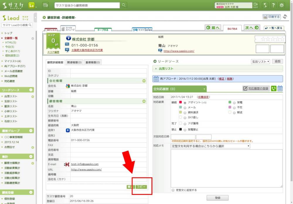 Lead、テレアポ職人、展示会職人 2017/02/02 顧客の「コピー機能」について 顧客登録 【簡単に複製・登録できます!】同じ会社だけど別の担当者を簡単に登録できないかな?そんなお悩みの方には、顧客の「コピー」機能が使えます!まず始めに、情報をコピーしたい顧客を開きます。画面下部に移動しますと、「コピー」ボタンがありますので、これをクリック。 すると顧客の新規登録画面へ移動します。そして各項目には先ほどの顧客と同じ情報が…!あとは顧客の情報を書き換えて登録。これだけでコピーができます。 ただし、重複チェック項目が変わっていない場合には登録できないため、ご注意を。 ぜひ、ご活用ください。