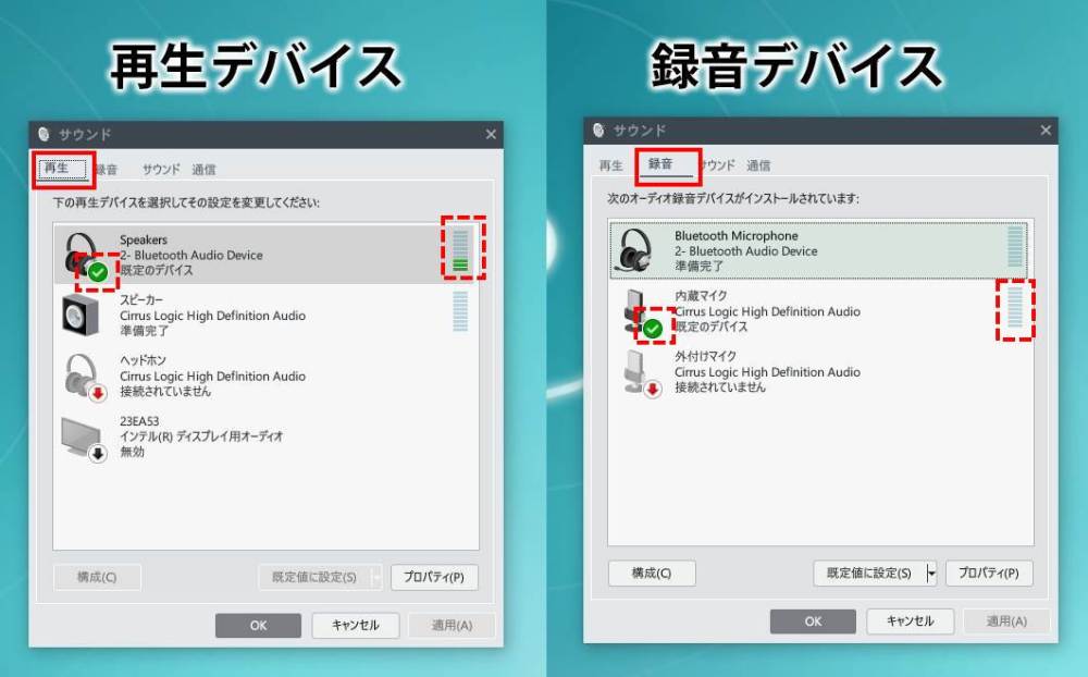 - 上部のタブでで「再生・録音デバイス」の設定画面を切り替えが可能