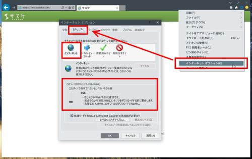 IEの右上にある歯車マークから「インターネットオプション」を開きます。インターネットオプションの「セキュリティ」にて、インターネットの「このゾーンのセキュリティレベル」が「高」になっている場合は「中高」もしくは「中」に設定すると改善することがございます。