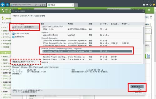 もし表示されていない場合は、左中央の「表示」箇所を「現在読み込まれているアドオン」にしますと表示されるかと思います。それでも表示されない場合は、Adobe FlashPlayerがインストールされていないと思われますので、Adobe公式サイトよりダウンロード・インストールを行ってください。