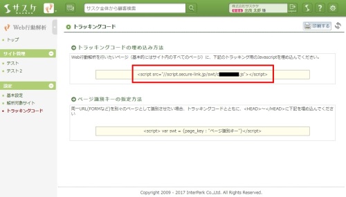 登録が完了しましたら左メニュー「トラッキングコード」へ進み、「トラッキングコード」を対象のサイトへ埋めてください。