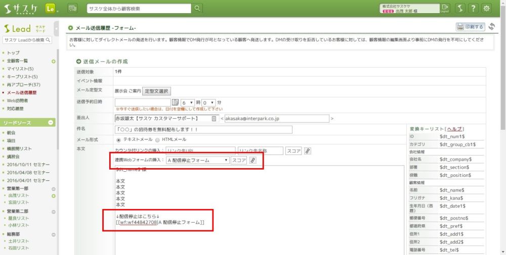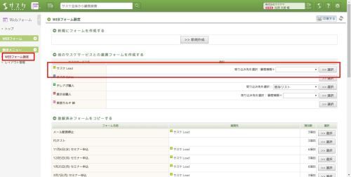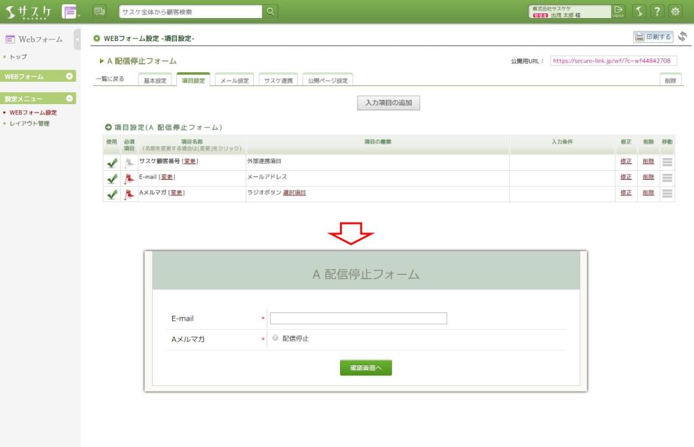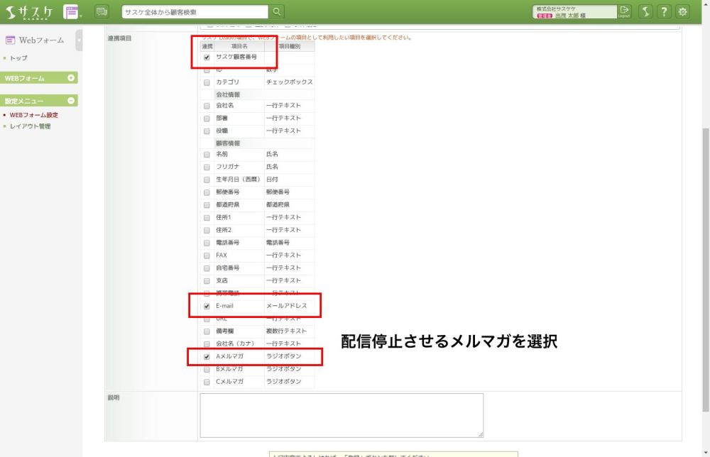 Webフォームの名称を入力後、「連携項目」でフォーム入力に必要な項目を設定します。ここで必ず必要となるものは「サスケ顧客番号」と「配信停止にさせるメルマガの項目」を設定します。