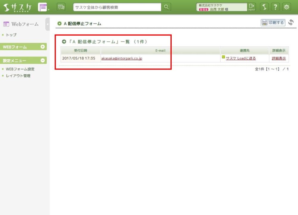 先ほどの配信停止ページへ入力があると、フォーム内の一覧で確認ができます。
