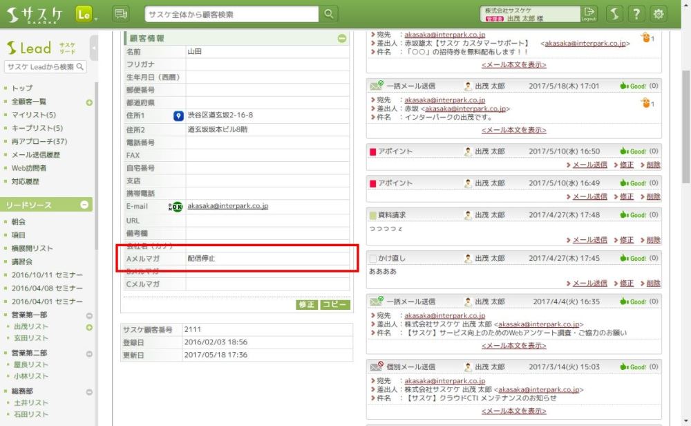 もし Aメルマガで配信するぞ! という時がありましたら、詳細検索より「Aメルマガ」が「未登録」の顧客を絞り込むことで、配信停止じゃない方々だけをリストアップできます。
