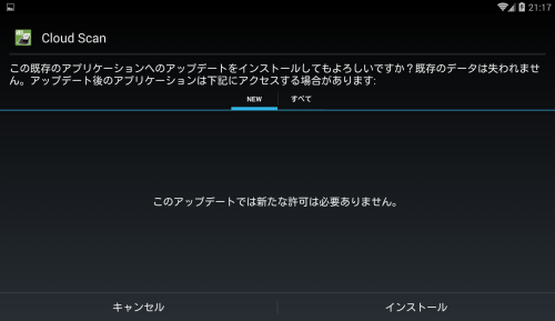 Cloud Scan 2017/05/18 Cloud Scanアプリのバージョンアップについて 困ったとき 【自動でバージョンアップ可能です】Cloud Scanアプリを起動した際、バージョンの更新があると以下のようなポップアップが表示されます。 「はい」を選択するとアプリのダウンロードが自動的に開始します。 ダウンロードが完了しますと、インストール画面が表示されますので「インストール」を選択し、バージョンアップを完了して下さい。 もし初期設定画面に戻ってしまったら?タイミングによっては「初期設定」の画面が表示されるケースがあります。 その際はアプリを一旦終了し、再度起動しますと通常通りの画面が表示されます。 ぜひ、ご活用下さい。