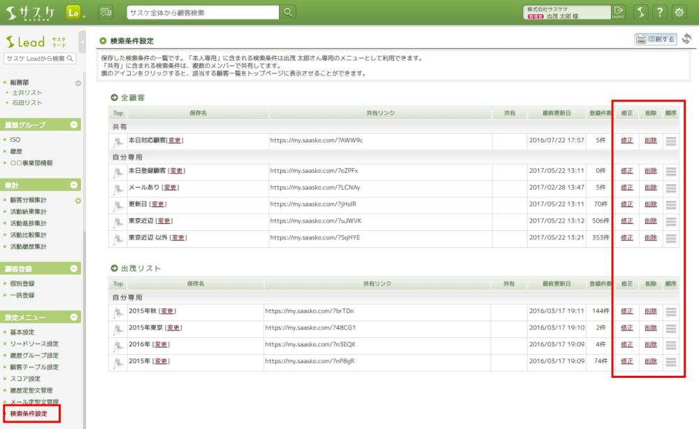 今までに作成した検索条件を作り替える機能は無いため、基本的には“再度検索条件を保存し直し、古いものを削除する”といった流れになります。こちらについては「検索条件を作成し直すには?」にてご紹介しておりますのでご確認下さい。