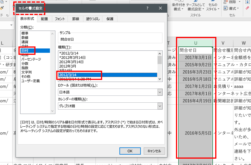 CSVデータに登録されている「2017年8月23日」を「2017/08/23」の状態にするには、日付の列を選択し、右クリックをして「セルの書式設定」を選択。その後、表示形式を「日付」の「2012/3/14」に設定することで一括変更することが可能です。