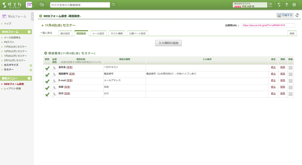 「項目設定」タブの「入力項目の追加ボタン」をクリックし、以下の項目を作成。