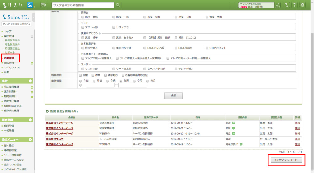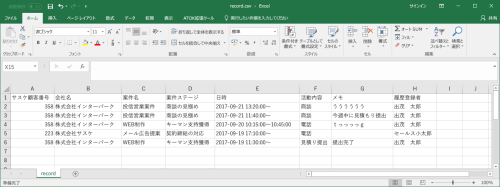 Sales 2017/09/25 サスケSalesのアップデート【活動履歴のCSVダウンロード機能】 アップデート 【活動履歴をCSVでダウンロードできます!】2017/09/25 サスケSalesがバージョンアップいたしました。活動履歴のCSVダウンロード機能サスケSalesの左メニュー「活動履歴」から、いままでの活動履歴をCSVとしてダウンロードすることができるようになりました。ダウンロードボタンは画面右下「CSVダウンロード」より行えます。 ダウンロードしたCSVデータは「record.csv」というファイル名で保存され、サスケ顧客番号や会社名、活動内容のメモも保存されています。 ぜひ、ご活用下さい。