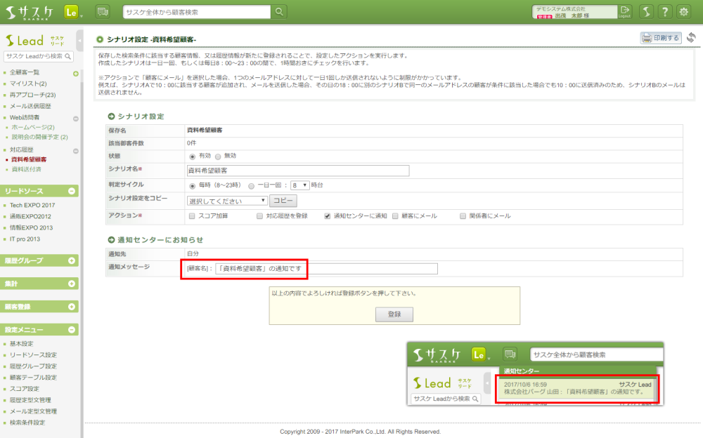 顧客に対応履歴を登録するアクションです。 - 通知センターに通知