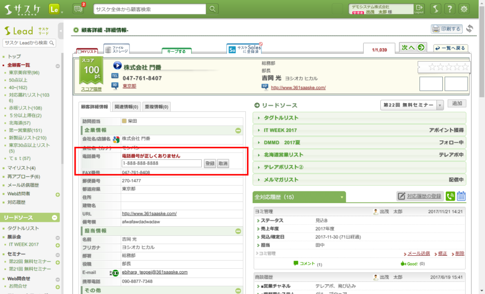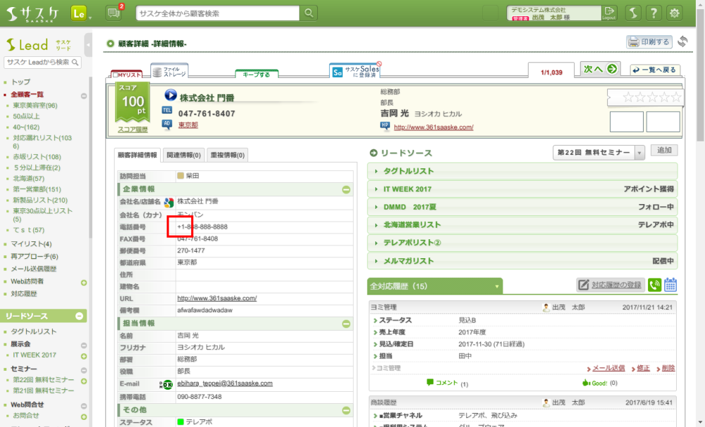 Lead、Sales、テレアポ職人 2018/02/08 外国の電話番号を登録するには? 【半角のプラスをつけましょう!】サスケでは電話番号を登録できる箇所があります。 しかし、国外の電話番号を登録しようとすると「電話番号が正しくありません」というエラーが出てしまいます。 そのときは電話番号の先頭に半角のプラス「+」をつけることで登録することができます! ぜひ、ご活用ください。