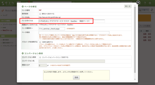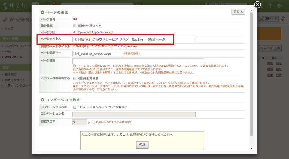 「識別キー」を記載しましたら「ページ識別キー」と日本語で記載されている箇所を分かりやすい名称に書き換えてください。イメージとしては
