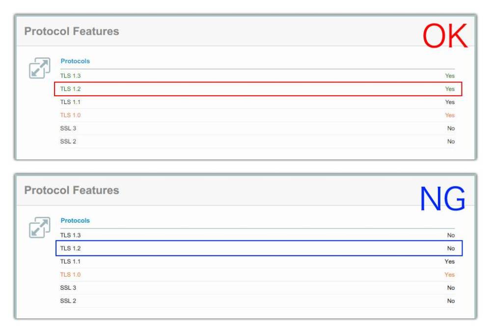 お使いのブラウザがTLS 1.2に対応しているかどうか、上記サイトにてご確認いただけます。「Protocol Features」の「Protocols」にて、「TLS 1.2」が「Yes」になっている場合は対応しております。