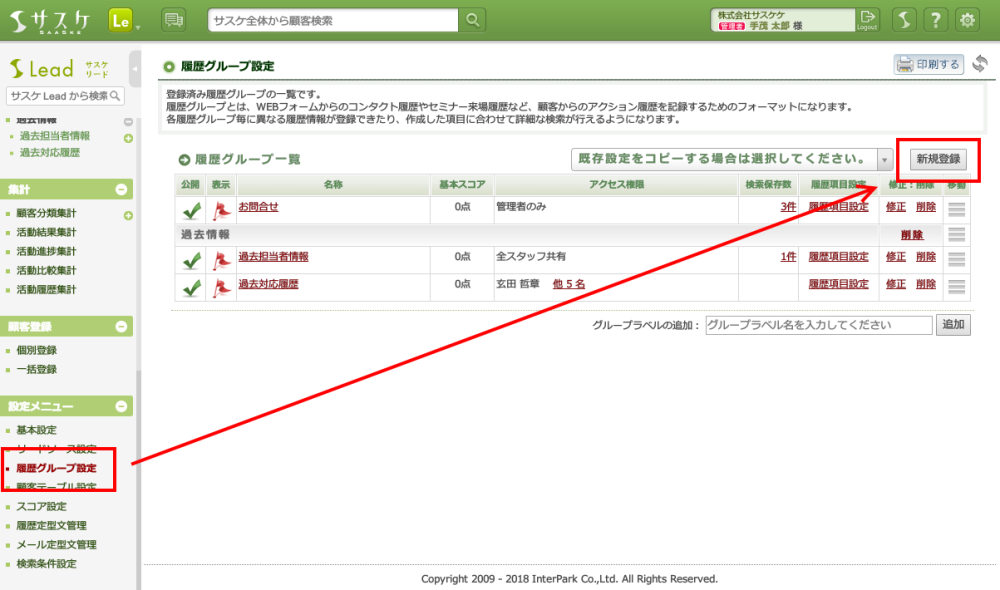 そんなときは「履歴グループ」を活用することで、対応履歴のように時系列ごとに見ることが出来るようになります。