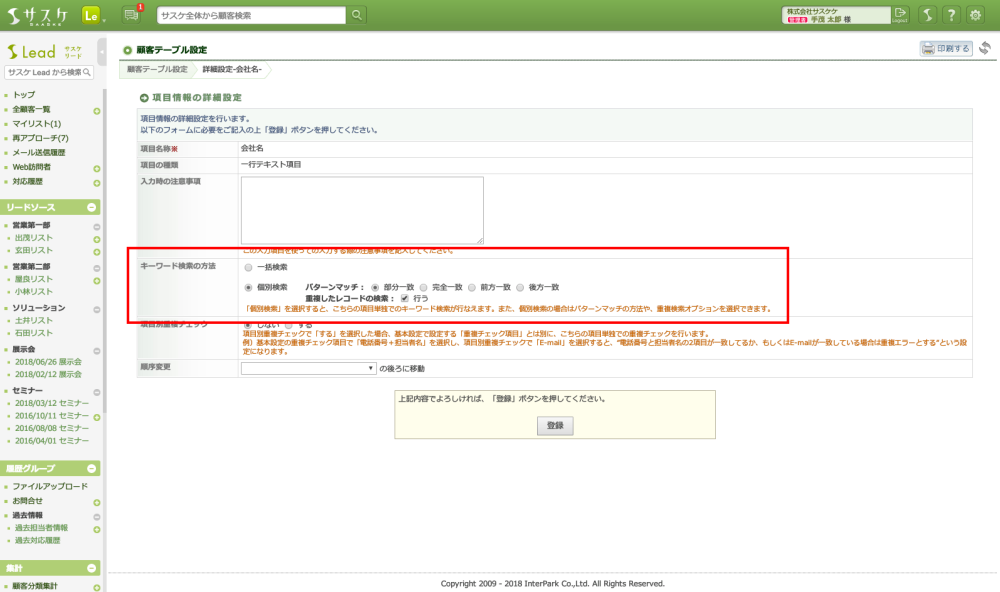 「個別検索」を選択した場合のみ、以下の設定を行うことが可能です。なお、当設定は一行テキスト項目のみ可能となります。