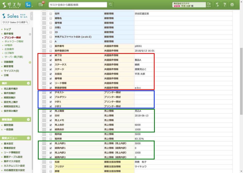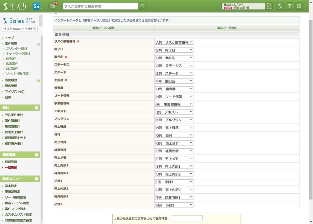 インポートの方法、項目の割当てについては顧客テーブルと同様の方法で行えるようになっておりますので、もしご不明点がある場合はサスケSalesのマニュアルも合わせてご確認くださいませ。