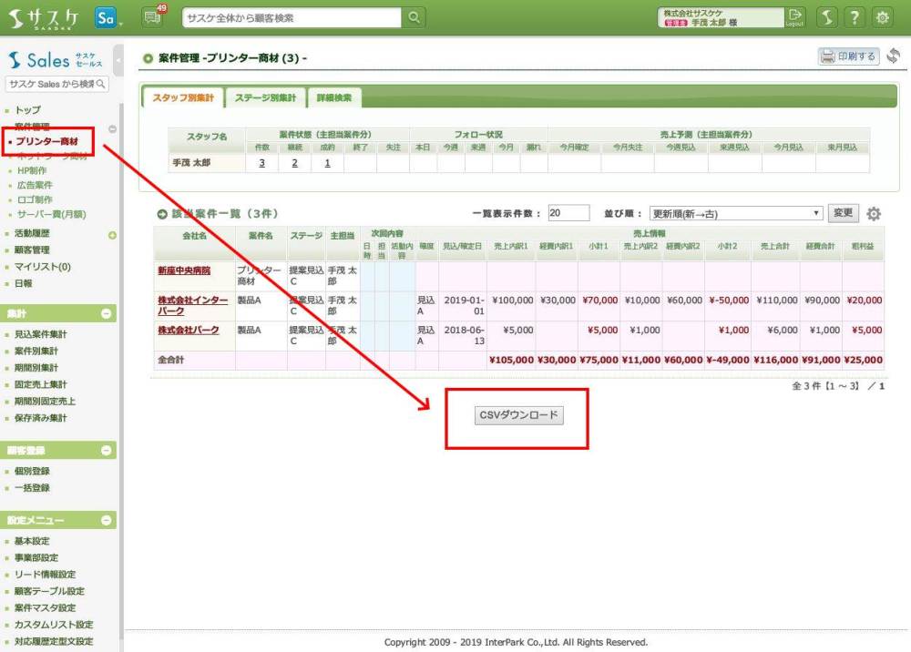 「サスケ顧客番号」をキーにして、該当企業に対して「案件情報」を新規登録する方法になります。