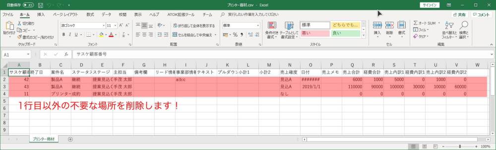 - ダウンロードしたCSVを開き、1行目以外を削除することでフォーマットを作成できます。