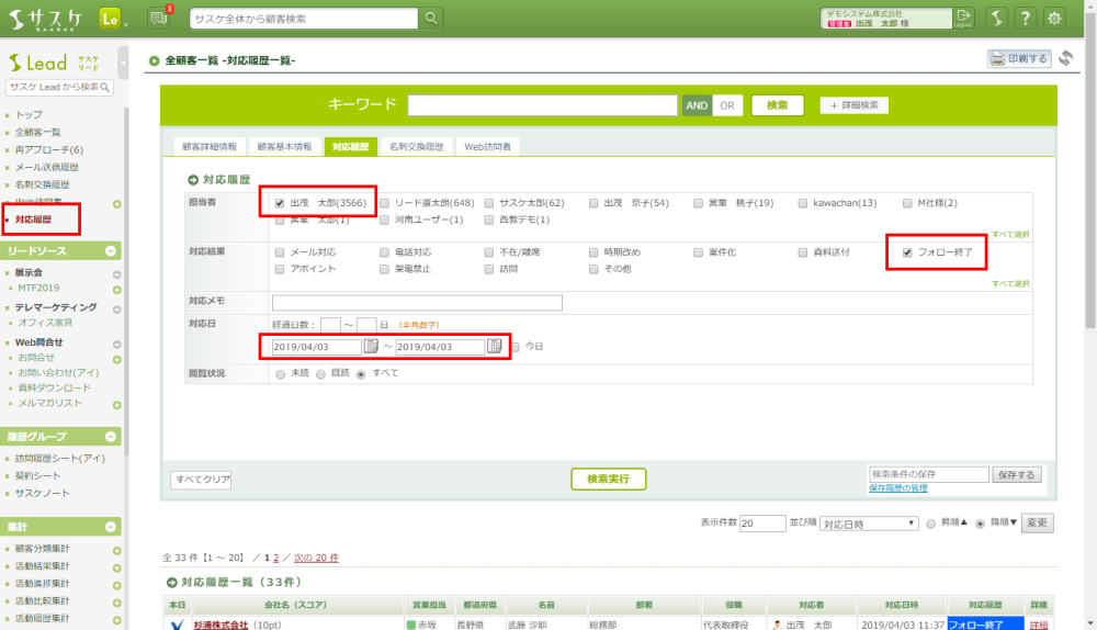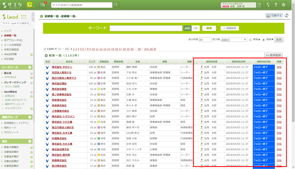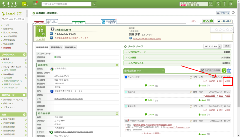 Lead、テレアポ職人 2019/04/04 間違えて履歴を一括で残してしまった場合… 困ったとき 【1つ1つ削除して頂きます…】以下のように対応履歴を一括で残してしまった… そんなとき、サスケLeadであれば左メニュー「対応履歴」にて、間違えて残してしまった該当履歴だけをピックアップすることが可能です! そこから顧客詳細ページを開き、1つ1つ該当履歴を削除する形となります。 ぜひ、ご活用下さい。