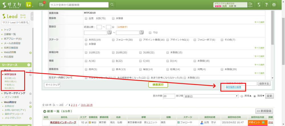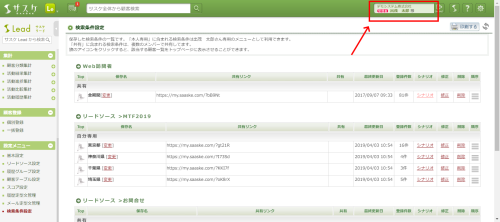- まずはじめに検索条件の保存を行なったリストを開き、「保存履歴の管理」をクリックします。
