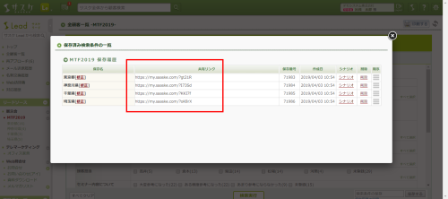 - 「保存済み検索条件の一覧」というポップアップが表示されますので、その中にある「共有リンク」を他のユーザー様へお伝えします。