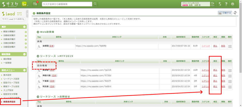 - 左メニュー「検索条件設定」を開き、共有したい検索条件の「修正」をクリックします。