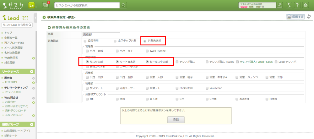 - 「全スタッフ共有」にチェックをすることで、全てにアカウントと検索条件を共有可能になります。