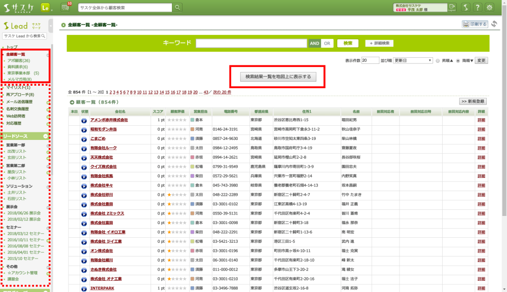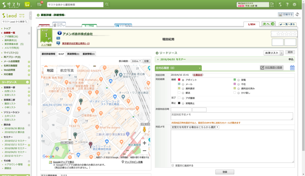 顧客詳細にてもMAPタブが表示され、サスケLead内に登録されている周辺企業の確認を行なうことができます。