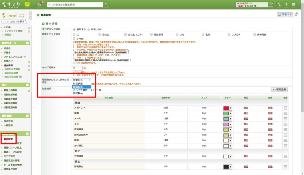 左メニュー「地図表示のピンに反映する項目」を設定することで、