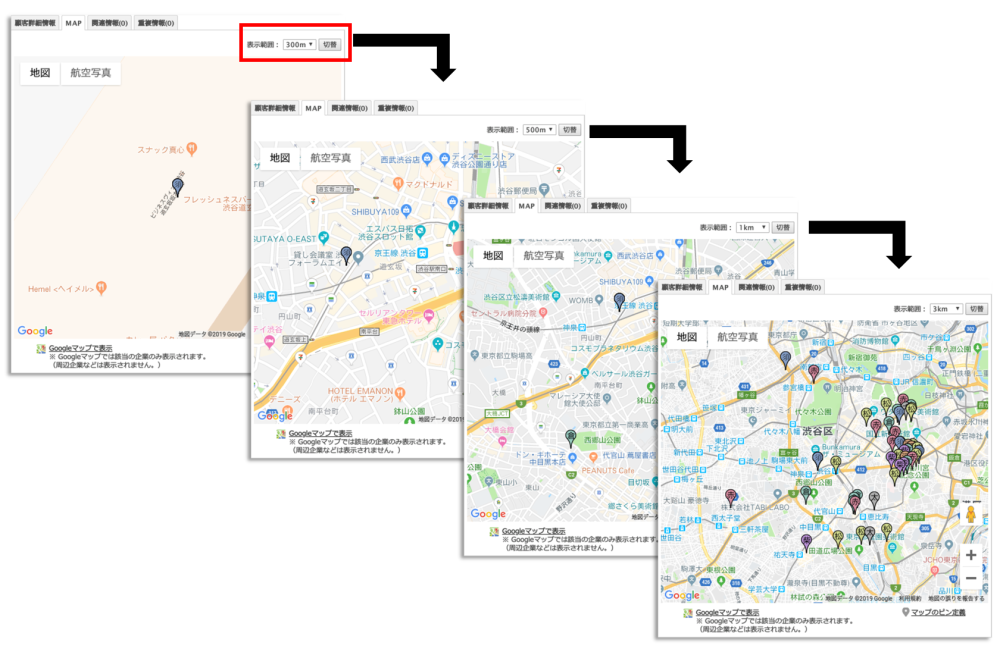 圏内に別企業が存在しない場合はマップの倍率は変わりません。