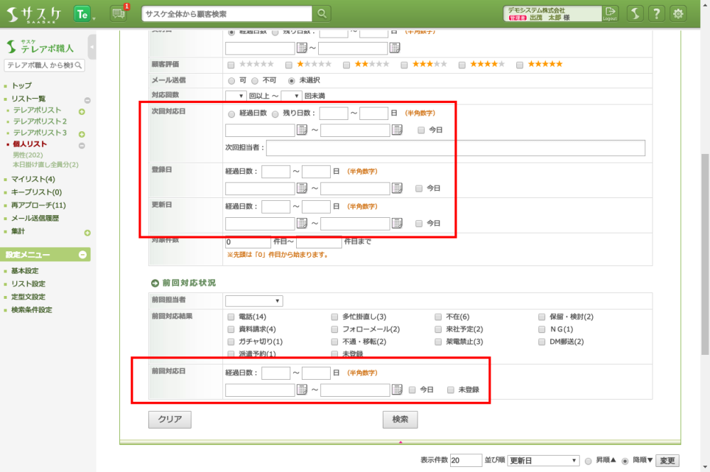 「次回対応日・登録日・更新日・前回対応日」に対し、「経過日数・残り日数」の検索を行えるようになりました。