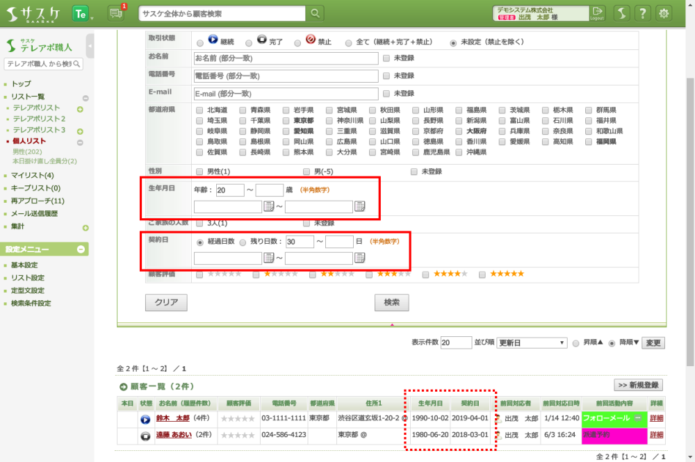 また顧客テーブル設定で作成した「日付項目」に対し、設定を行なうことで「経過日数・残り日数」もしくは「年齢」の検索を行えるようになりました。