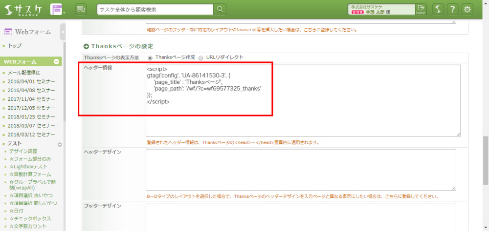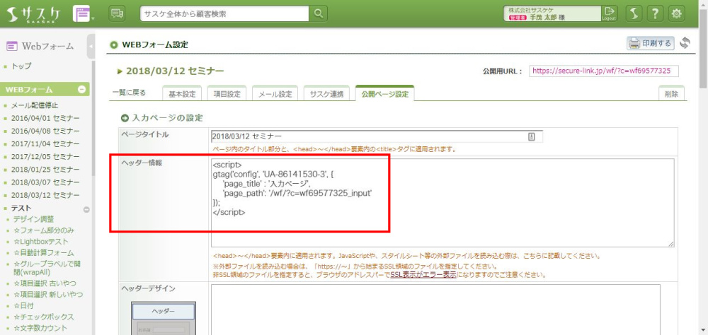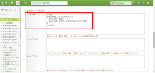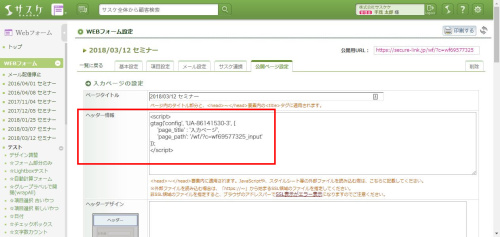 動いていることを確認できたら、公開ページの各「ヘッダー情報」へ設定していきます。