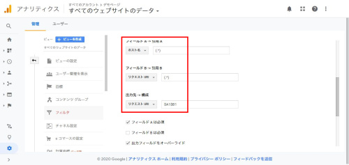 「フィールドB->引用B」の設定を「リクエストURI」「(.*)」に設定し、