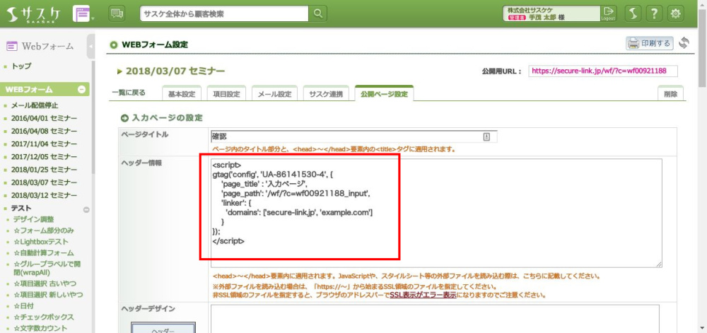 動いていることを確認できたら、公開ページの各「ヘッダー情報」へ設定していきます。