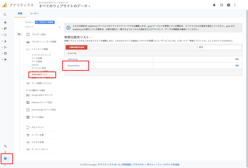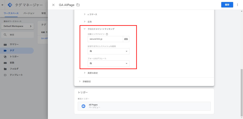 引き続き「クロスドメイン トラッキング」まで移動し、以下の設定もします。