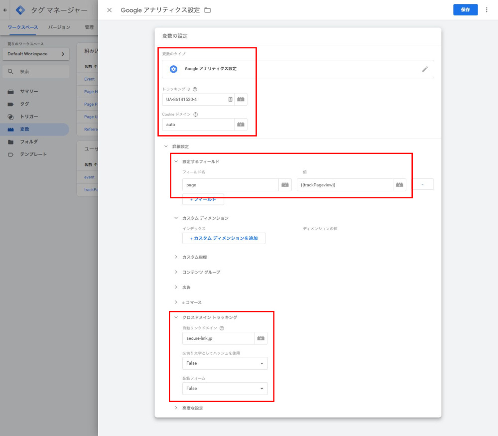 {{trackPageview}}(変数の2つめで設定した名称を記入します) - (クロスドメイン トラッキング)自動リンクドメイン
