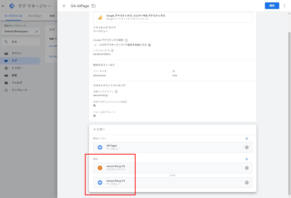 secure-link.jp CE(トリガーの1つめを利用します) - (トリガー)除外
