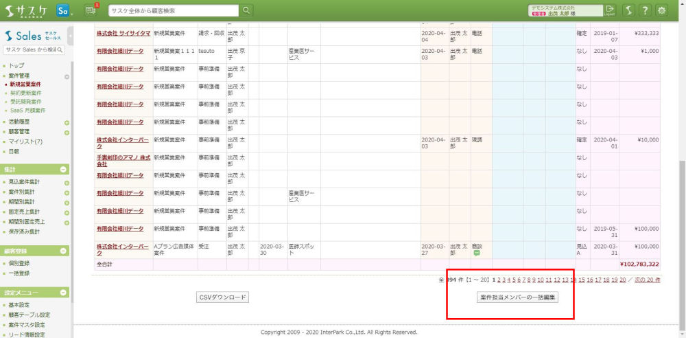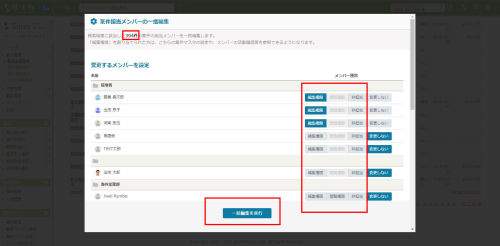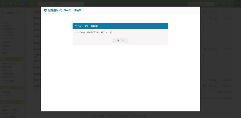 Sales 2020/04/14 サスケSalesのアップデート【案件担当メンバーの一括編集機能】 アップデート 【編集権限を一括で付けられます!】2020/04/14、サスケSalesがアップデートしました。案件担当メンバーの一括編集機能案件一覧の右下に「案件担当メンバーの一括編集」ボタンが追加されました。 このボタンをクリックすることで、先ほど表示されていた案件全ての「メンバー選択」を変更することが出来ます。 変更が完了すると、完了の旨が表示されます。 ぜひ、ご活用下さい。