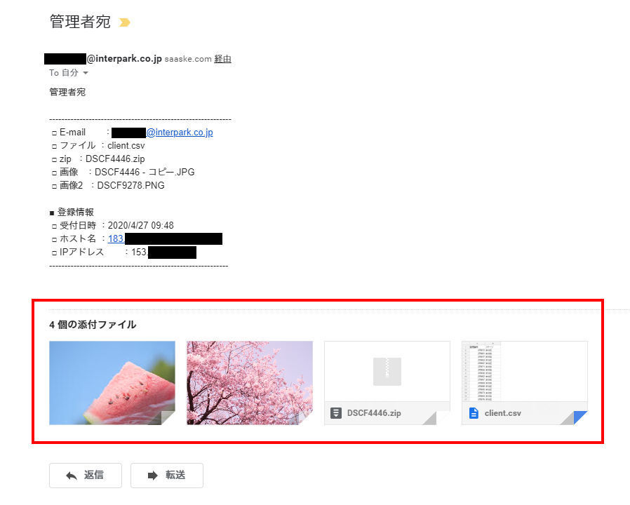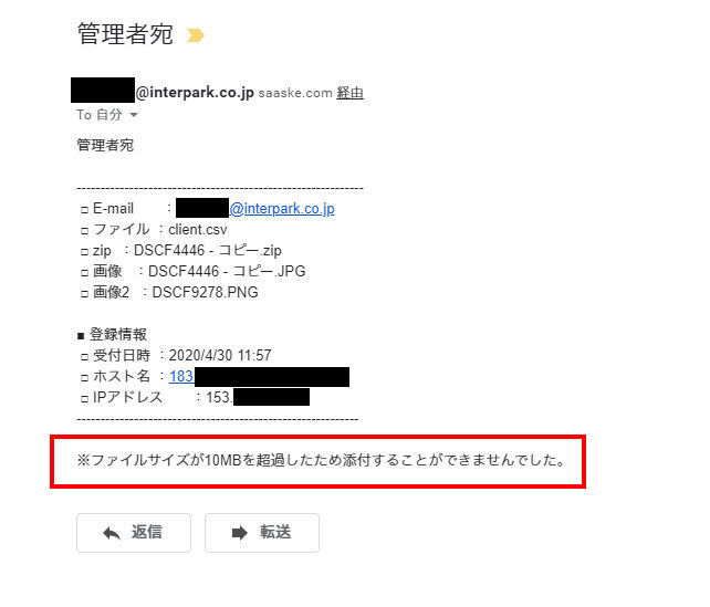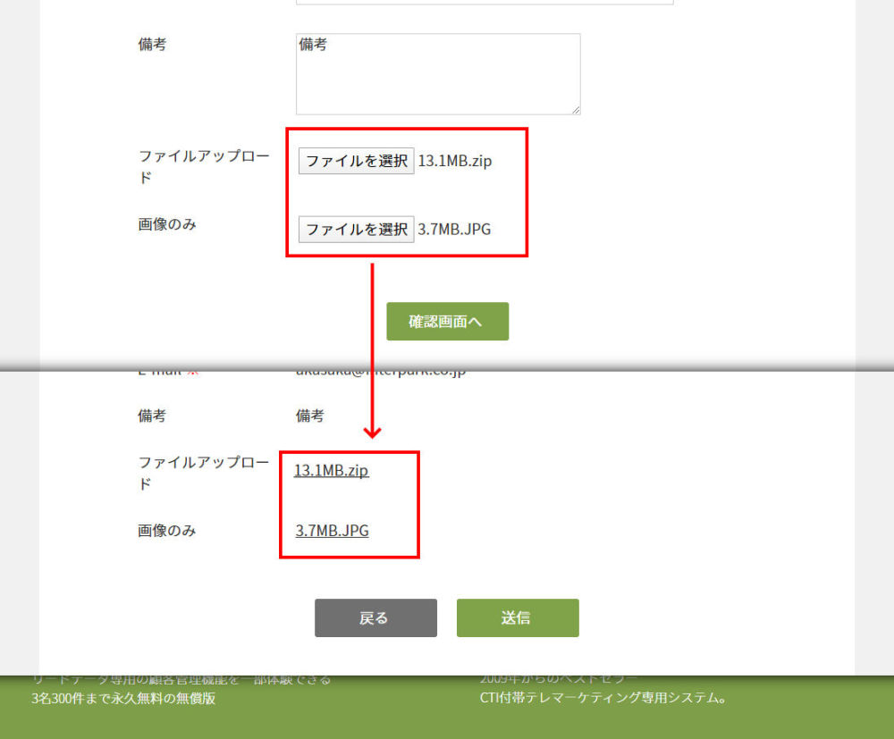 チェックを入れることで、管理者宛メールにてアップロードされたファイルを添付して受信することが出来ます。なおウイルススキャンはされませんので、お使いのメールシステム・セキュリティソフト側で対策をお願いします。
