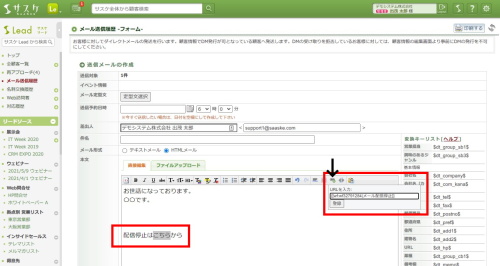 続いて「HTMLメール」に変更し、本文の文章を記入します。そしてリンク化したいテキストを選択し「リンク挿入」ボタン(矢印の先にあるボタン)をクリックし、「URLを入力」にて『コピーしたテキスト』を入力し登録させます。