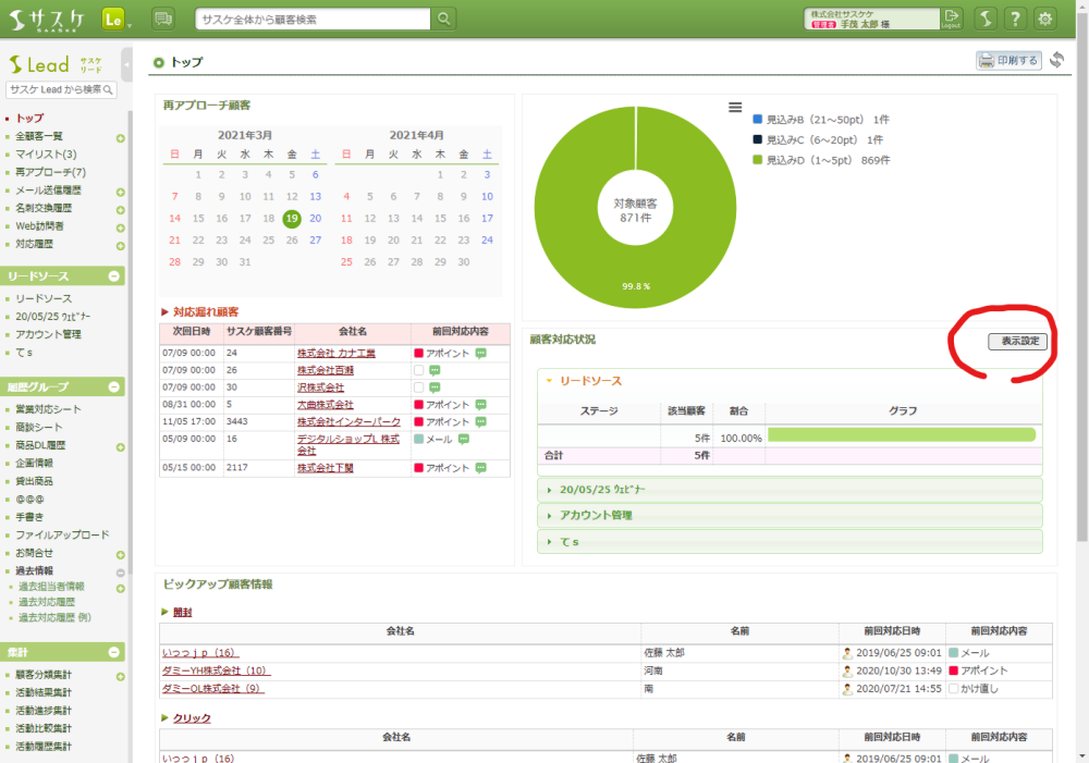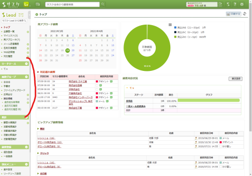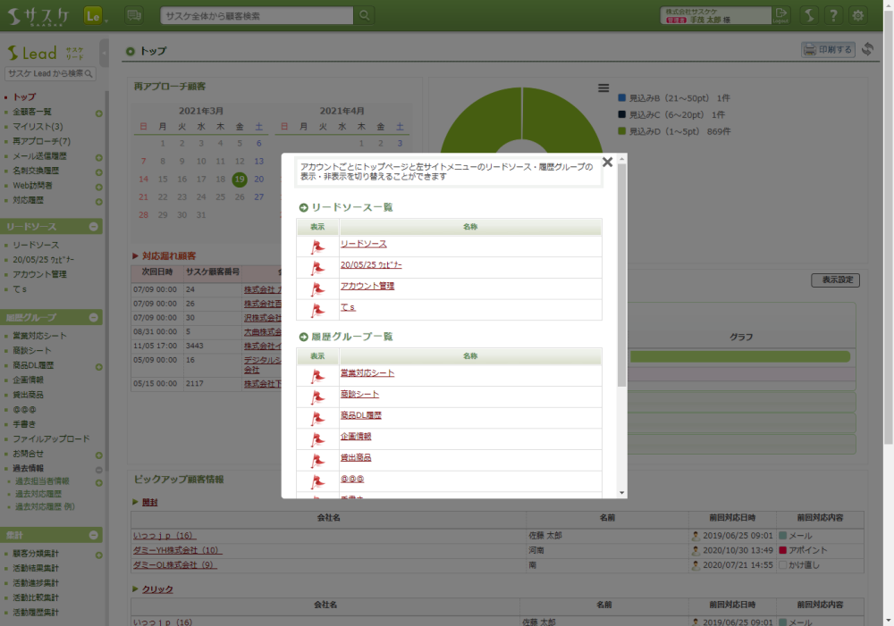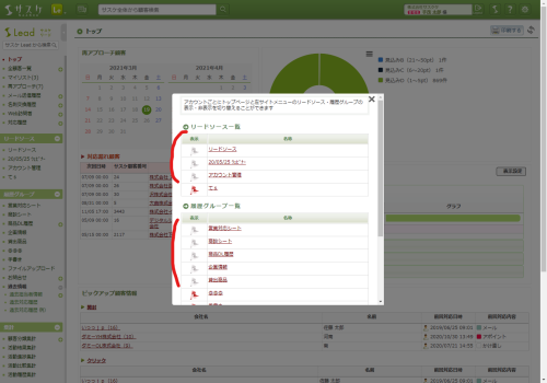 設定が保存されるとリロードがかかり、左メニューから該当するリードソース・履歴グループが非表示となります。なお、この設定は個人の設定で他のユーザーには一切影響致しませんのでご安心ください。