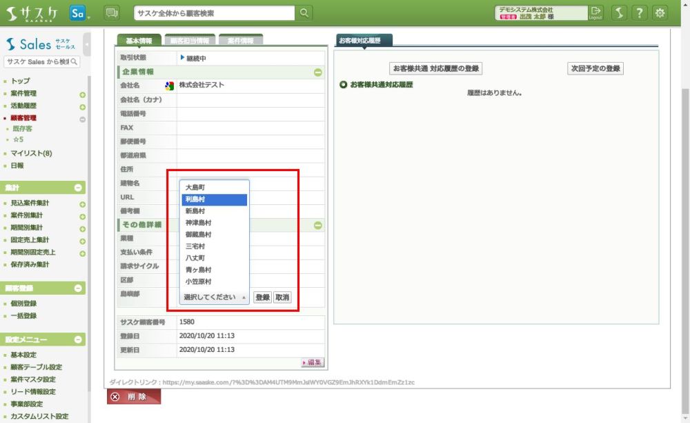 Sales 2020/10/16 サスケSalesのアップデート【プルダウン項目の検索機能】 アップデート 2020年10月16日、サスケSalesがアップデートしました。プルダウン項目の検索機能サスケSalesに、Lead同様「プルダウン項目内の検索」ができるようになりました。 なお、項目数が20件未満の場合は検索はできませんのでご留意下さいませ。